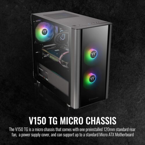 Il Thermaltake V150 Tempered Glass Micro Chassis è un case compatto della serie V, pensato per schede madri Micro ATX e Mini ITX. Misura 440 x 208 x 398 mm e pesa 5,45 kg. È il primo modello micro della linea ad essere proposto a un prezzo economico. La struttura, in acciaio SPCC, è interamente nera e include due pannelli in vetro temperato da 4 mm (anteriore e laterale). Supporta fino a quattro slot di espansione, due unità da 2,5" e due da 3,5". Il sistema di raffreddamento include una ventola posteriore da 120 mm preinstallata (1000 rpm, 16 dBA), con supporto per ulteriori ventole e radiatori fino a 280 mm sul pannello frontale. Le limitazioni di spazio prevedono un’altezza massima per il dissipatore CPU di 155 mm, una lunghezza massima per la GPU di 350 mm (senza ventole frontali) e una lunghezza massima per l’alimentatore standard PS2 di 220 mm. Il pannello I/O frontale offre 1 porta USB 3.0, 2 USB 2.0 e un’uscita audio HD.