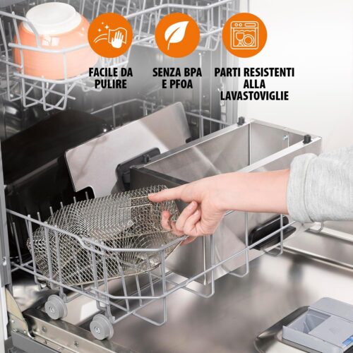 Friggitrice ad aria calda da 4,5 L con 8 programmi preimpostati, timer digitale da 60 minuti e termostato regolabile tra 80 °C e 200 °C. Adatta per cucinare fino a 1,2 kg di cibo per 7 persone. Dotata di controllo touch, display LCD, contenitore rimovibile, rivestimento antiaderente, impugnatura termoisolante e piedini antiscivolo. Potenza di 1500 W, arresto di sicurezza contro il surriscaldamento, design nero e argento, facile da pulire.
