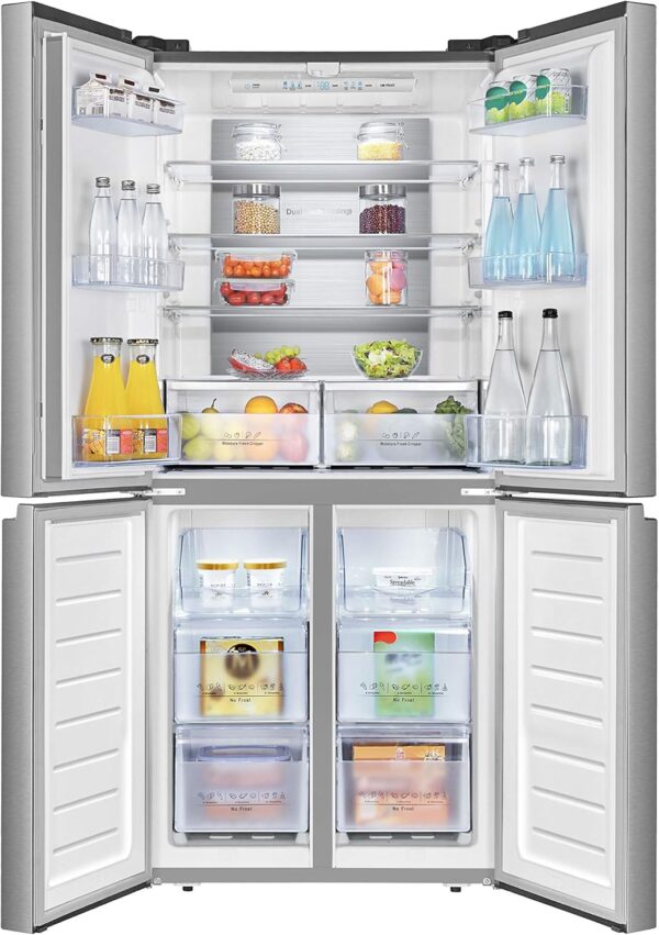 Il frigorifero da 454 litri dispone di tecnologia Total No Frost per evitare ghiaccio e mantenere i cibi freschi più a lungo. Metal Cooling assicura un’aria fredda distribuita uniformemente grazie alla parete metallica posteriore. My Fresh Choice consente di regolare la temperatura da -18° a -5° in una zona del congelatore, ideale per cibi delicati. Dual Tech Cooling usa due circuiti separati per mantenere temperatura e umidità ottimali, prevenendo odori e secchezza.