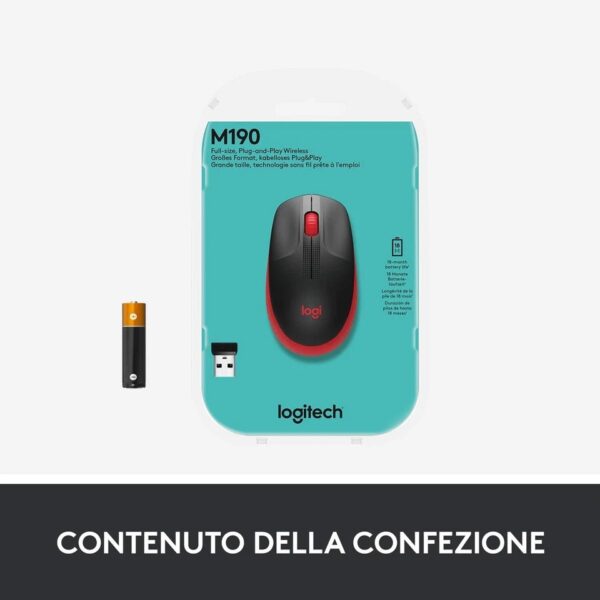 Mouse wireless Logitech M190 rosso, ergonomico e preciso, con connessione stabile fino a 10 metri. Batteria a lunga durata fino a 18 mesi e design confortevole per uso quotidiano senza affaticamento. Ideale per lavoro e gaming.