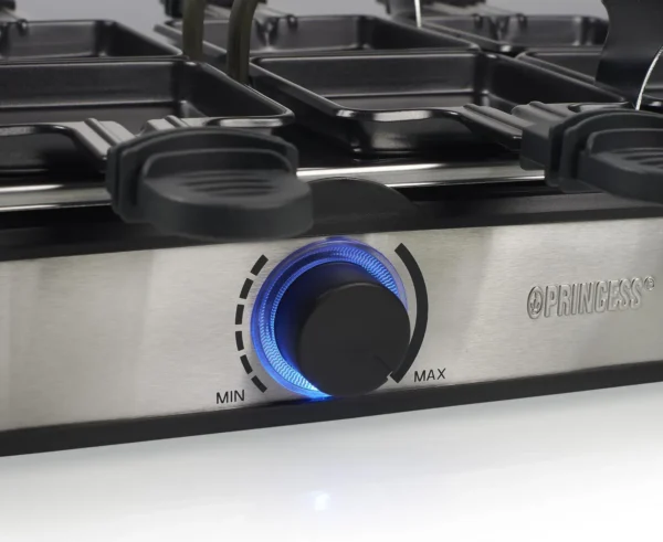La bistecchiera raclette Princess 8 Deluxe ha due superfici di cottura da 21 x 21 cm (griglia e pietra), ideale per 8 persone. Con 1400W di potenza, garantisce un riscaldamento rapido e una cottura uniforme. Perfetta per raclette, carne, pesce e verdure.