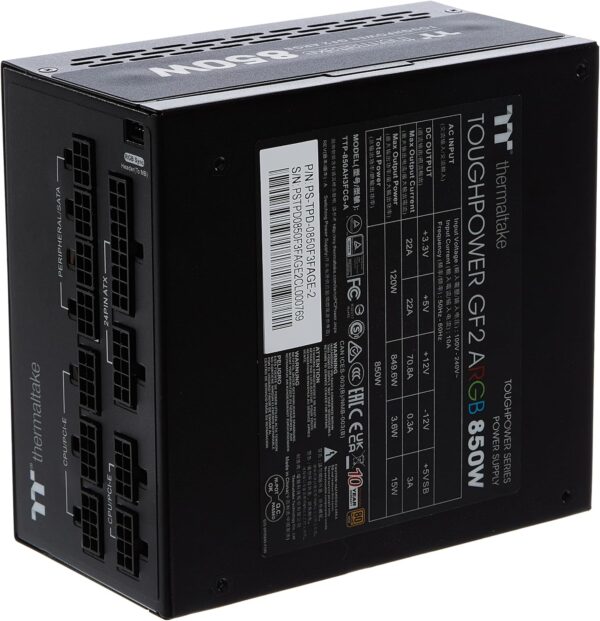 THERMALTAKE Alimentatore 850W Modulare Gold 80+ – Prestazioni elevate e design RGB con certificazione 80 PLUS Gold. Compatibile con ASUS Aura Sync, MSI Mystic Light, GIGABYTE RGB Fusion e Asrock Polychrome. Dotato di ventola Riing Duo RGB 140mm con 18 LED ARGB e pannello laterale illuminato. Ideale per build gaming stabili e personalizzate.
