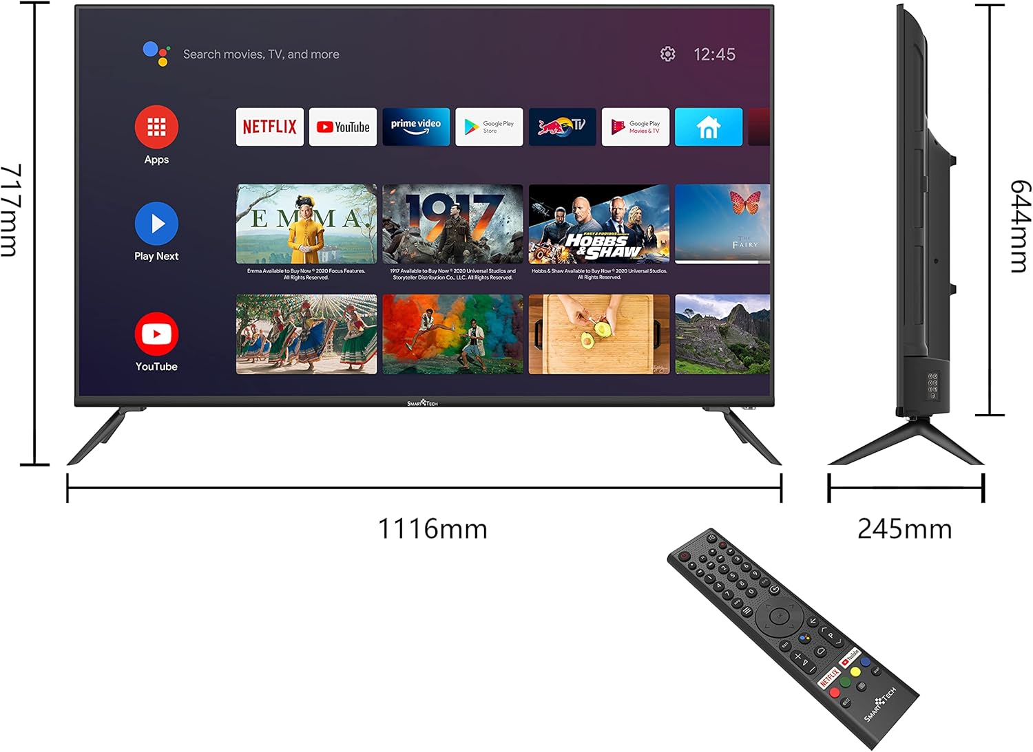 SMART TECH TV 50″ LED UHD 4K SMART ANDROID T2/S2 SMT-50F30UC2M1B1 offre immagini nitide e colori vividi grazie al display Ultra HD 4K con HDR10. Dotato di sistema Android 9.0, ti permette di accedere facilmente a Netflix, YouTube e tante altre app. Connettività completa con Wi-Fi, Bluetooth, HDMI e USB. Sintonizzatore DVB-T2/S2 per tutte le trasmissioni digitali più recenti. Design elegante con cornice sottile e supporto a parete VESA. Trasforma la tua esperienza visiva con questa Smart TV performante e versatile.