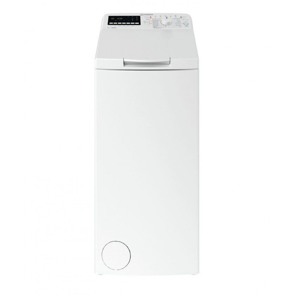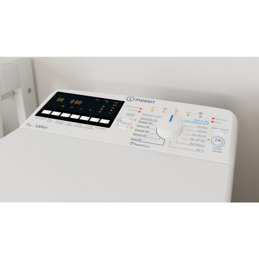 Lavatrice Indesit BTW B7231P a carica dall’alto da 7 kg, 1200 giri, classe D. Con 14 programmi, partenza differita e consumi contenuti (69 kWh/100 cicli). Dimensioni: 40x60x90 cm.
