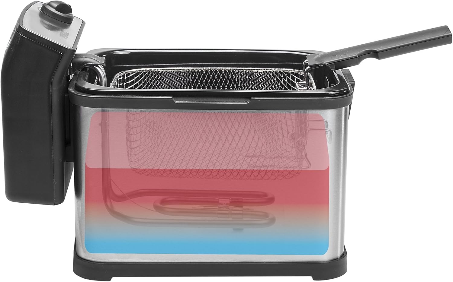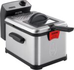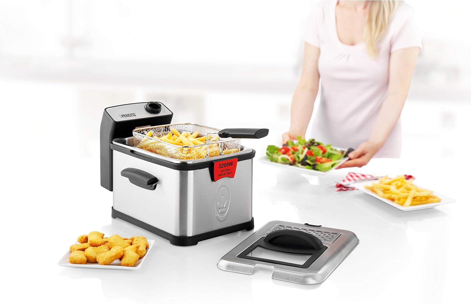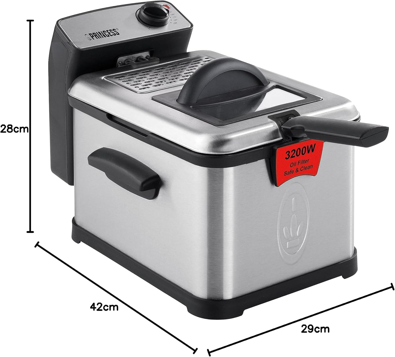 Friggitrice da 3 litri con struttura singola in acciaio inossidabile, colore nero e acciaio. Dotata di termostato regolabile fino a 190 °C, controllo rotativo e spia luminosa. Ha una zona fredda per evitare la bruciatura dei residui, ciotola removibile e impugnatura comoda. Facile da pulire, potenza 3200 W, tensione 220–240 V, protezione contro il surriscaldamento.