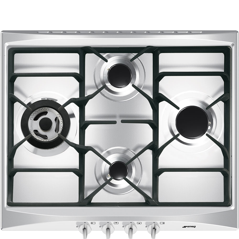 Piano cottura a gas SMEG SR264XGH2 da 60 cm con 4 fuochi, griglie in ghisa e superficie in acciaio inox resistente al calore e agli urti termici.